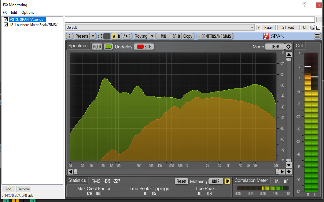 On production, I think this is generally well made DnB. Percussion is very punchy and the bass sounds great, which is basically what we need the most. Samples are generally good although I felt the pads had too much content around the 2-3kHz range, which can get fairly annoying during certain parts of the track. My other sample related nitpick is that the main lead synth is too dry and at times it sounds odd when the notes cut-off so abruptly. Finally, I also have some doubts about how loud the track gets (consistently -4/5 LUFS during the loudest parts) and how much basically every frequency range is being pushed. This is a picture of SPAN during the 3:00 portion:
